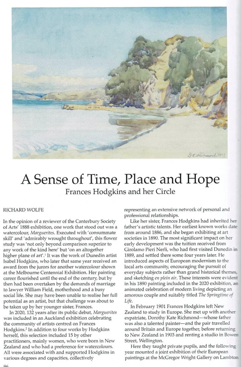 The Winter 2021 Issue of Art New Zealand featured a four page exhibition review by art writer Richard Wolfe of Frances Hodgkins and Her Circle.