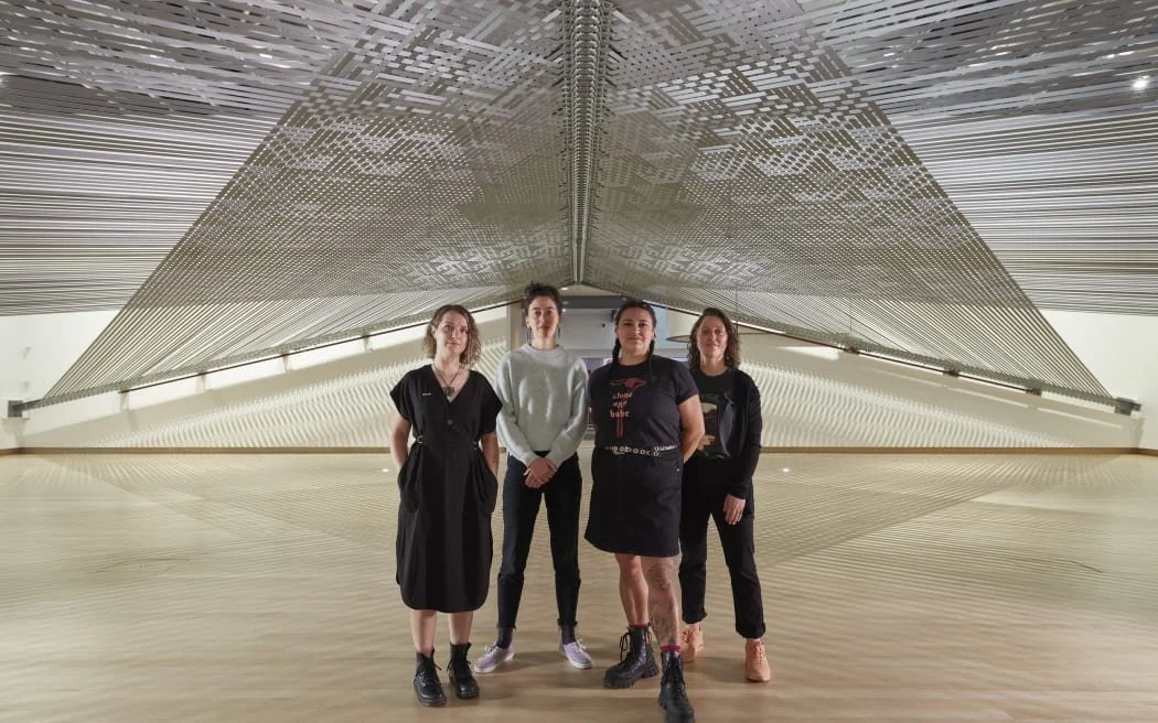 The Mataaho Collective comprises four Māori women — Reweti, Erena Baker, Sarah Hudson and Terri Te Tau. Its large-scale work Takapau is an installation made of woven and latticed polyester hi-vis tie-downs and was recently shown at Te Papa.